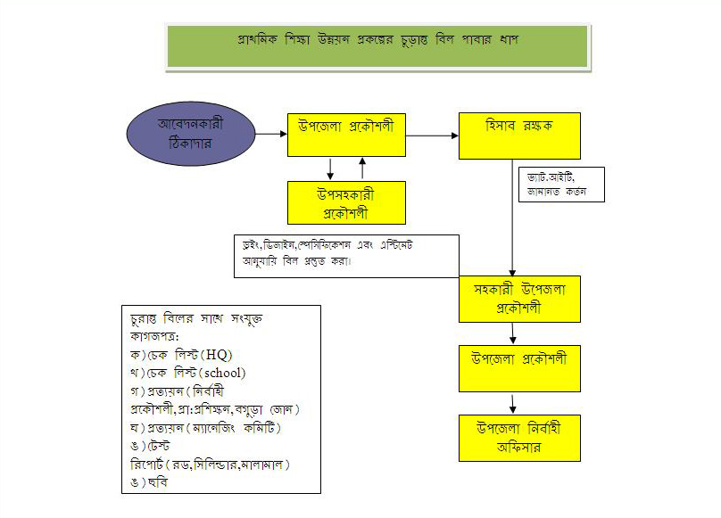 | ২ | প্রাথমিক বিদ্যালয় উন্নয়ন কাজের বিল প্রাপ্তির ধাপ | দেখুন | |